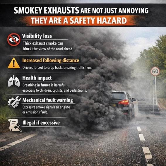 Excessive exhaust smoke creates instant danger. Drivers behind cannot clearly see brake lights, potholes, cyclists, pedestrians, or sudden hazards. At speed, even a second of lost visibility can result in a crash.